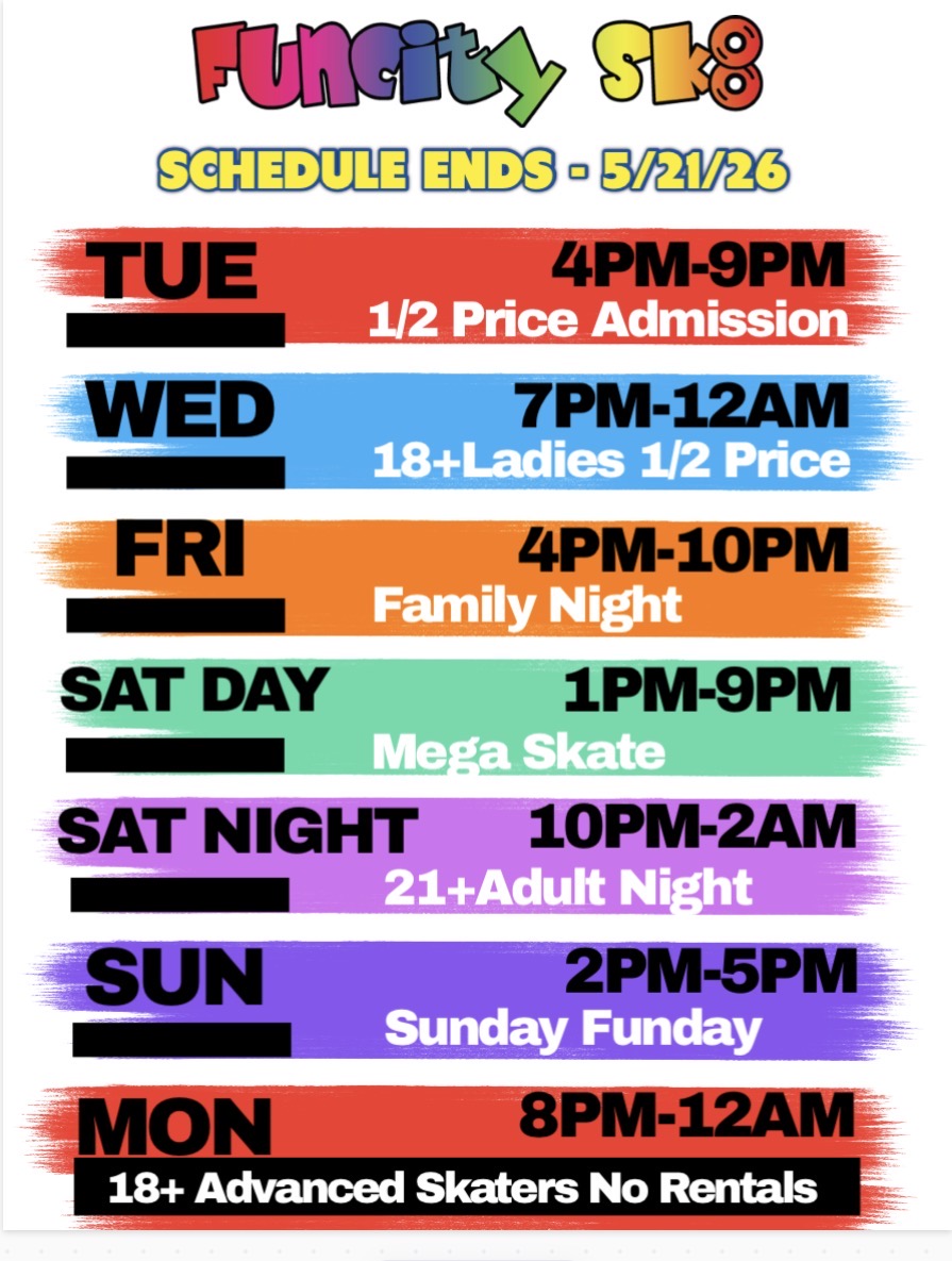 Current Schedule Click here for Summer Schedule! Current Schedule Ends 5-21-2026 We accept cash or credit for all payments. If paying with Credit Card at Funcity a non-cash 4% adjustment fee will be added to all purchases (Purchase tickets on-line to by-pass the fee.)